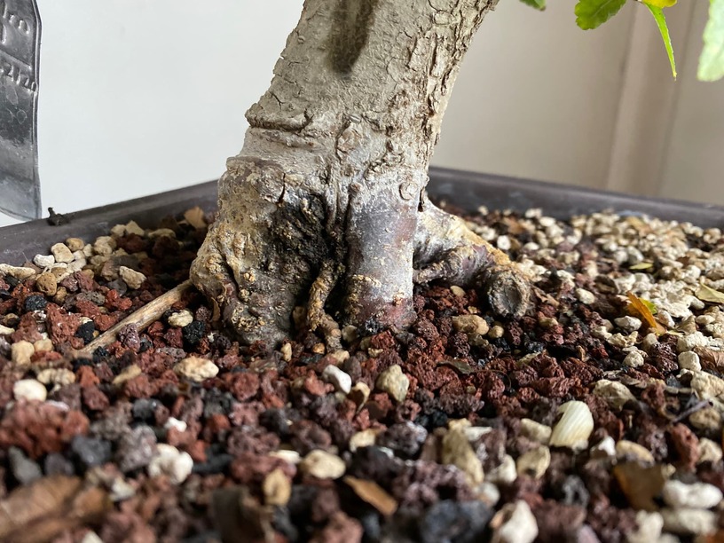 I know the 2 main ways to improve nebari is air-layering or thread/approach grafting. I’ve also heard that elms can be quite difficult for both of these techniques because of their rapid grown and callus formation. This tree was last repotted in Feb 2020 on a board in lava/pumice/cinder to help with some improvement, but probably should have been planted a little deeper into the soil to encourage root growth a little further up.
