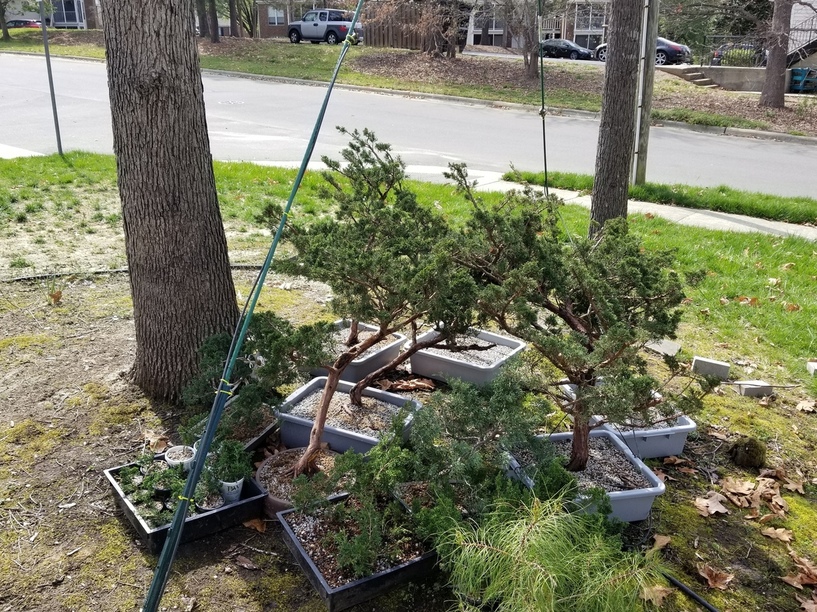 I have the junipers under some shaded trees where I am misting the foliage for 2 minutes every hour. The Pines are in full sunlight and the Chinese Quince is shaded. Being in the Raleigh, NC area the weather has been pretty good (not freezing) in the last few weeks and looks good moving forward.