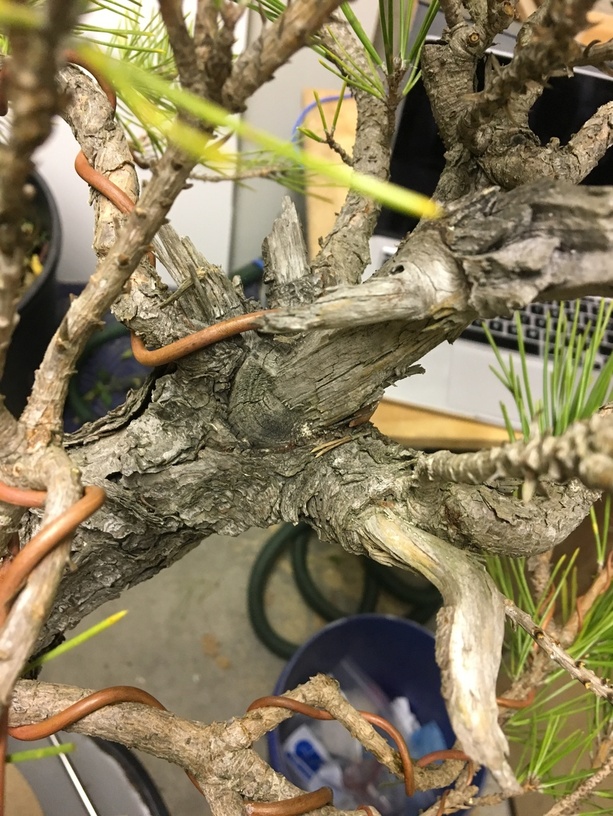 I would try to reduce the first 6 whorl if possible to 4, and think of developing the branches and then reduce again once you are getting some more branch development, or you can comit to the two you want to keep. Hard to make a call from these pics. The old stump could be hollowed out a bit to help the calus to grow over it… trying to remember the relavant stream with this in…