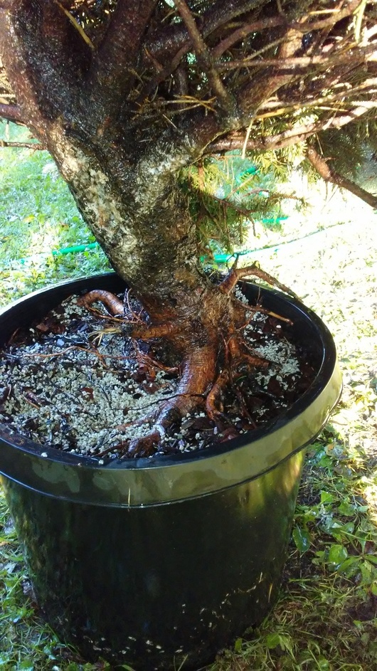 I asked Ryan about this tree on the Q&A. It turned out the place I got it from was going out of business so I could not leave it until spring. It is a well developed blue spruce bush, 3 ft. high and a 4 ft diameter, 6 in. trunk, and ~12 in. nabari. I put it in a mix of bush soil and pumice as Ryan suggested. The pot was too deep, so to offset the weight of the canopy, I filled it half way with Turface and chicken grit. As suggested I will be misting it 4-5 times a day until winter sets in. Fingers crossed for it to live.
