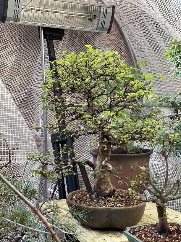 One of my ulmus parvifolia (Chinese elm) trees, and an acer palmatum pre-bonsai that started to leaf out in December. Not an unusual occurrence in Dallas (Zone 8). Once their buds start to break, it is off to the heated greenhouse. In March, I will put them out into the Dallas sun. Both varieties will do well until July, at which point, I will have to put them in shade. By August, they will be in dormancy. October will find them starting to lose leaves. By Thanksgiving they will have lost most of their leaves. And in a warm December, they will begin to leaf out again by the middle of the month. Heavy pruning and repotting needs to happen like it’s early spring. I don’t like it, but I’ve had the elm for about 25 years, and it is what it is.