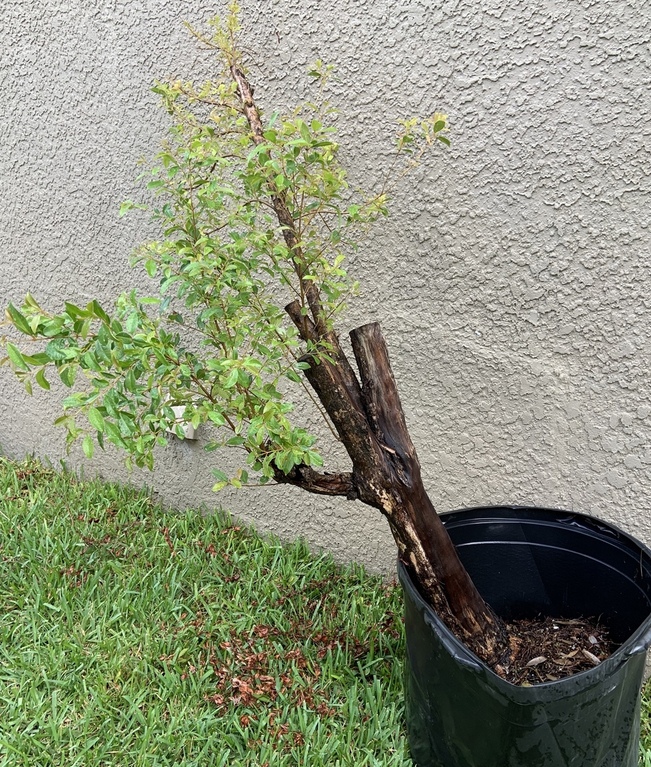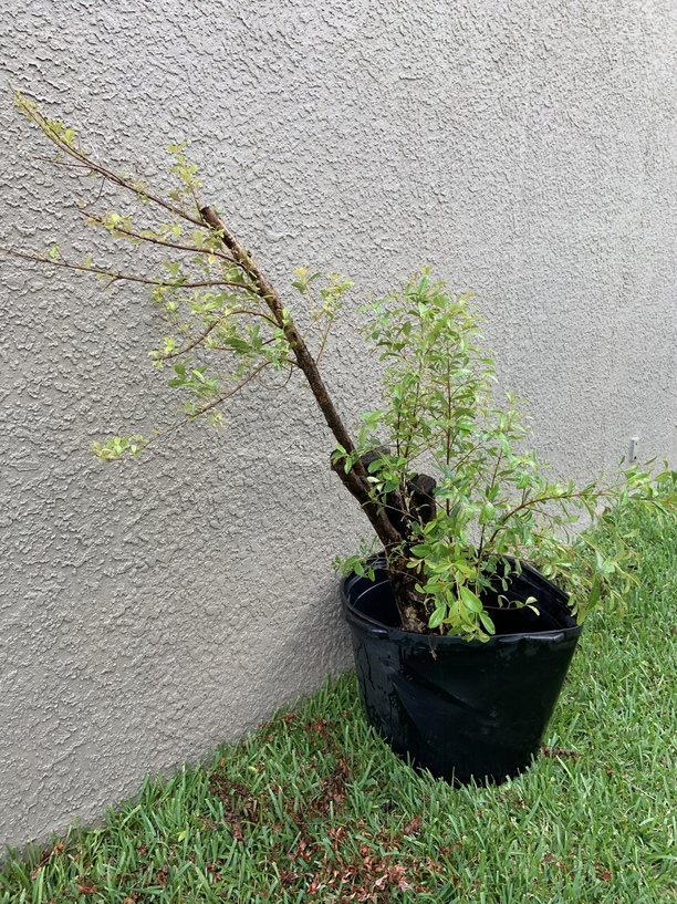 The tree looks healthy, but it looks like it’s recovering from something traumatic. Given that its history is an unknown, I’d give it another year in a nursery container; just not that nursery container. Find a container large enough to hold the tree in the center. When trees grow crooked in a nursery container for long enough, the root ball will be misshapen. Trying to center the tree in the same sized container might be difficult or impossible. To slip-pot this tree into another container, carefully remove the tree without disturbing the rootball. Then position the tree in the center of the new container and pack around it using standard potting soil. Since you’re in Tampa, keep the tree in the shade for a couple weeks. If you have access to Wilt-Pruf, use it before transplanting.