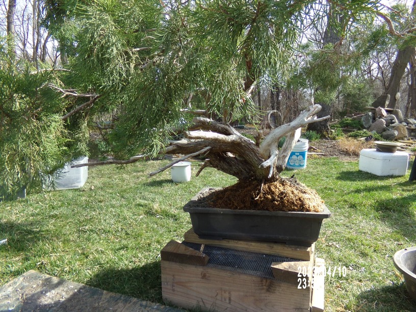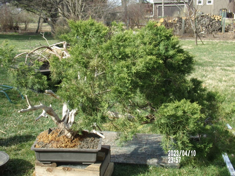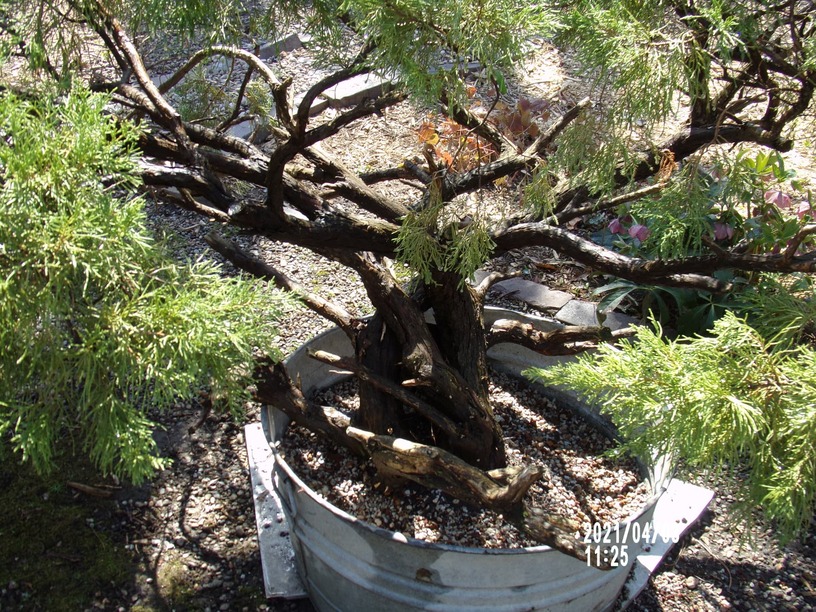 Dug up a landscape Chinese juniper on April 4 2021. Have been working dead wood and splitting live vein from dead to give the branches motion. Pretty good back budding so elected to take it out of the galvanized wash basin and put it into a mica pot. Photos of collected tree and process to repot.
