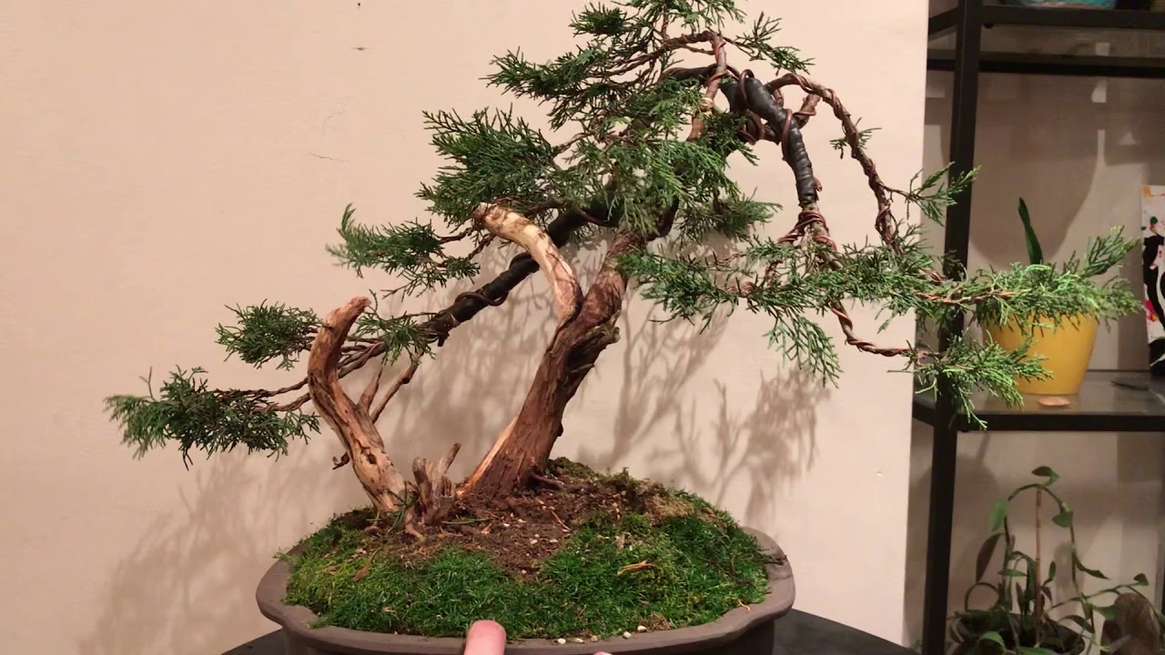 I am quite happy with this first styling of this tree. It was quite challenging to come up with a styling plan. I am still making wiring mistakes but I definitely see an improvement from the previous juniper I worked on in both style and technique. This is a nursery stock Juniperus chinensis but it has that wonderful puma pee smell of sierra junipers. This tree was potted in the spring of 2016 and crushed under a big tree that fell in my garden in the spring of 2017 and lost some branches. It was repotted in the spring of 2018 and grew well. It was styled for the first time now. The trunk and defining branch movement go to the left. I think to be honest I didn’t quite decide if the apex should go to the to the right creating a dynamic design, or to the left to create a harmonious design. As a consequence the apex is a bit confused. I might retouch it later.