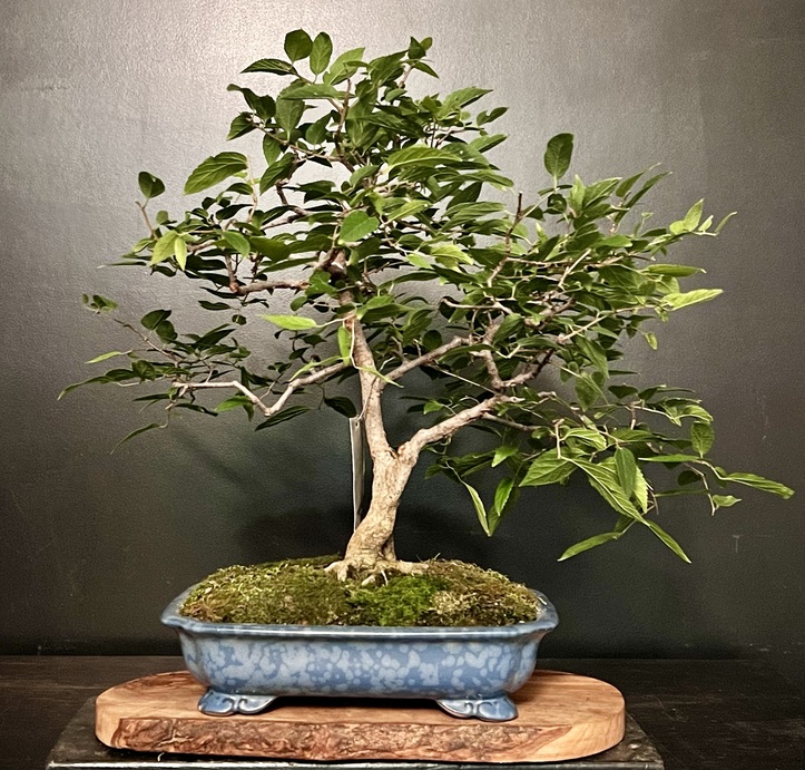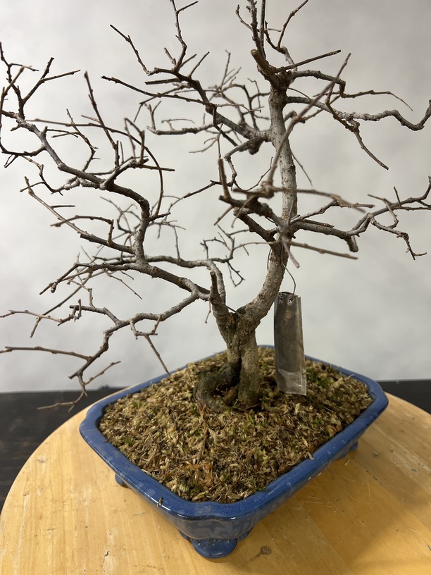 This is a hackberry I’ve been working on since 2016. This spring during the repot I discovered the nebari that was hidden under the soil and seems destined for the front. Problem was the straight trunk line in the middle. After leaf fall this week I applied a guy wire that I think may help the issue. It opened up the right side a bit too. It will be interesting to see how it looks next spring after it opens up.
