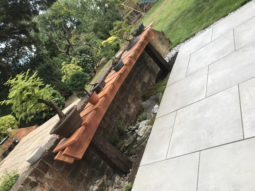 I have 2 benches. One, a 6 ft 2 level bench I made from cedar two years ago, and the other an 8 ft picnic style bench I made with cedar 2x4’s and plastic bench frames I bought from Mayfair. In between the benches you can see my Dawn Redwood, a Larch Forest on the stone bench, and a bushy Arakawa that will get potted up next spring.