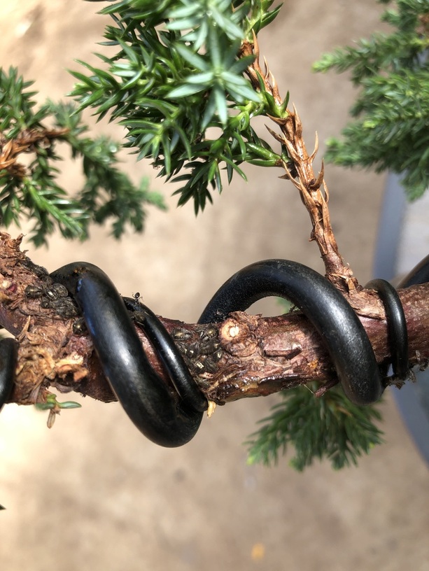 I think they may be juniper scale insects. Google them and see if they look similar. I have a landscape juniper infested with themThey don’t seem to harm it but I am keeping by bonsai well away. At some point I will probably have to think about dealing with them, especially as I am going to use the big tree for airlayers.