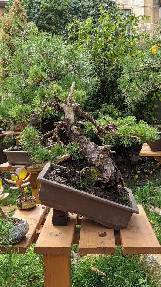 IPhone 7. Yes a small larch that I believe was a cast off at a club meeting. I have no idea what to do with it. I liked the top angling off, but this summer, the thing took off and is still growing. Time to make a decision!
