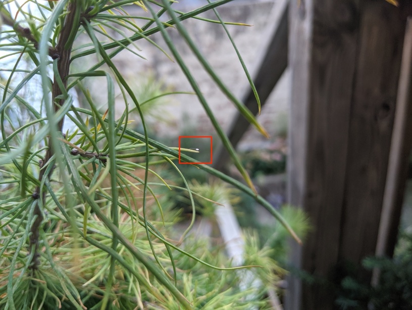 I see a spider web like thing, that might be spidermites. And what are those white spots on the larch, if it’s not just chem residue that might be
